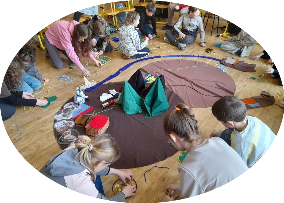 - program vyžaduje usazení žáků v kruhu (na židlích, popř. na koberci) s dostatečným volným prostorem uprostřed, kde se postupně tvoří obraz z didaktického materiálu
